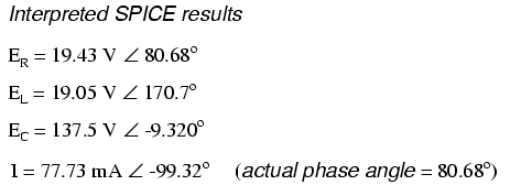 Now, with all quantities of opposition to electric current expressed in a common, complex number format (as impedances, and not as resistances or reactances), they can be handled in the same way as plain resistances in a DC circuit. This is an ideal time to draw up an analysis table for this circuit and insert all the "given" figures (total voltage, and the impedances of the resistor, inductor, and capacitor). Unless otherwise specified, the source voltage will be our reference for phase shift, and so will be written at an angle of 0o. Remember that there is no such thing as an "absolute" angle of phase shift for a voltage or current, since it's always a quantity relative to another waveform. Phase angles for impedance, however (like those of the resistor, inductor, and capacitor), are known absolutely, because the phase relationships between voltage and current at each component are absolutely defined. Notice that I'm assuming a perfectly reactive inductor and capacitor, with impedance phase angles of exactly +90 and -90o, respectively. Although real components won't be perfect in this regard, they should be fairly close. For simplicity, I'll assume perfectly reactive inductors and capacitors from now on in my example calculations except where noted otherwise. Since the above example circuit is a series circuit, we know that the total circuit impedance is equal to the sum of the individuals, so: Inserting this figure for total impedance into our table: We can now apply Ohm's Law (I=E/R) vertically in the "Total" column to find total current for this series circuit: Being a series circuit, current must be equal through all components. Thus, we can take the figure obtained for total current and distribute it to each of the other columns: Now we're prepared to apply Ohm's Law (E=IZ) to each of the individual component columns in the table, to determine voltage drops: Notice something strange here: although our supply voltage is only 120 volts, the voltage across the capacitor is 137.46 volts! How can this be? The answer lies in the interaction between the inductive and capacitive reactances. Expressed as impedances, we can see that the inductor opposes current in a manner precisely opposite that of the capacitor. Expressed in rectangular form, the inductor's impedance has a positive imaginary term and the capacitor has a negative imaginary term. When these two contrary impedances are added (in series), they tend to cancel each other out! Although they're still added together to produce a sum, that sum is actually less than either of the individual (capacitive or inductive) impedances alone. It is analogous to adding together a positive and a negative (scalar) number: the sum is a quantity less than either one's individual absolute value. If the total impedance in a series circuit with both inductive and capacitive elements is less than the impedance of either element separately, then the total current in that circuit must be greater than what it would be with only the inductive or only the capacitive elements there. With this abnormally high current through each of the components, voltages greater than the source voltage may be obtained across some of the individual components! Further consequences of inductors' and capacitors' opposite reactances in the same circuit will be explored in the next chapter. Once you've mastered the technique of reducing all component values to impedances (Z), analyzing any AC circuit is only about as difficult as analyzing any DC circuit, except that the quantities dealt with are vector instead of scalar. With the exception of equations dealing with power (P), equations in AC circuits are the same as those in DC circuits, using impedances (Z) instead of resistances (R). Ohm's Law (E=IZ) still holds true, and so do Kirchhoff's Voltage and Current Laws. To demonstrate Kirchhoff's Voltage Law in an AC circuit, we can look at the answers we derived for component voltage drops in the last circuit. KVL tells us that the algebraic sum of the voltage drops across the resistor, inductor, and capacitor should equal the applied voltage from the source. Even though this may not look like it is true at first sight, a bit of complex number addition proves otherwise: Aside from a bit of rounding error, the sum of these voltage drops does equal 120 volts. Performed on a calculator (preserving all digits), the answer you will receive should be exactly 120 + j0 volts. We can also use SPICE to verify our figures for this circuit: ac r-l-c circuit v1 1 0 ac 120 sin r1 1 2 250 l1 2 3 650m c1 3 0 1.5u .ac lin 1 60 60 .print ac v(1,2) v(2,3) v(3,0) i(v1) .print ac vp(1,2) vp(2,3) vp(3,0) ip(v1) .end freq v(1,2) v(2,3) v(3) i(v1) 6.000E+01 1.943E+01 1.905E+01 1.375E+02 7.773E-02 freq vp(1,2) vp(2,3) vp(3) ip(v1) 6.000E+01 8.068E+01 1.707E+02 -9.320E+00 -9.932E+01 The SPICE simulation shows our hand-calculated results to be accurate. As you can see, there is little difference between AC circuit analysis and DC circuit analysis, except that all quantities of voltage, current, and resistance (actually, impedance) must be handled in complex rather than scalar form so as to account for phase angle. This is good, since it means all you've learned about DC electric circuits applies to what you're learning here. The only exception to this consistency is the calculation of power, which is so unique that it deserves a chapter devoted to that subject alone.