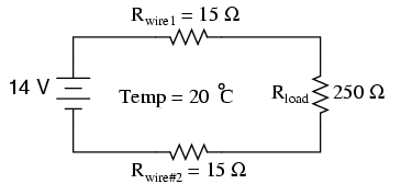 Temperature coefficient of resistanceYou might have noticed on the table for specific resistances that all figures were specified at a temperature of 20o Celsius. If you suspected that this meant specific resistance of a material may change with temperature, you were right! Resistance values for conductors at any temperature other than the standard temperature (usually specified at 20 Celsius) on the specific resistance table must be determined through yet another formula: The "alpha" (α) constant is known as the temperature coefficient of resistance, and symbolizes the resistance change factor per degree of temperature change. Just as all materials have a certain specific resistance (at 20o C), they also change resistance according to temperature by certain amounts. For pure metals, this coefficient is a positive number, meaning that resistance increases with increasing temperature. For the elements carbon, silicon, and germanium, this coefficient is a negative number, meaning that resistance decreases with increasing temperature. For some metal alloys, the temperature coefficient of resistance is very close to zero, meaning that the resistance hardly changes at all with variations in temperature (a good property if you want to build a precision resistor out of metal wire!). The following table gives the temperature coefficients of resistance for several common metals, both pure and alloy: TEMPERATURE COEFFICIENTS OF RESISTANCE, AT 20 DEGREES C Material Element/Alloy "alpha" per degree Celsius ========================================================== Nickel -------- Element --------------- 0.005866 Iron ---------- Element --------------- 0.005671 Molybdenum ---- Element --------------- 0.004579 Tungsten ------ Element --------------- 0.004403 Aluminum ------ Element --------------- 0.004308 Copper -------- Element --------------- 0.004041 Silver -------- Element --------------- 0.003819 Platinum ------ Element --------------- 0.003729 Gold ---------- Element --------------- 0.003715 Zinc ---------- Element --------------- 0.003847 Steel* --------- Alloy ---------------- 0.003 Nichrome ------- Alloy ---------------- 0.00017 Nichrome V ----- Alloy ---------------- 0.00013 Manganin ------- Alloy ------------ +/- 0.000015 Constantan ----- Alloy --------------- -0.000074 * = Steel alloy at 99.5 percent iron, 0.5 percent carbon Let's take a look at an example circuit to see how temperature can affect wire resistance, and consequently circuit performance: This circuit has a total wire resistance (wire 1 + wire 2) of 30 Ω at standard temperature. Setting up a table of voltage, current, and resistance values we get: At 20o Celsius, we get 12.5 volts across the load and a total of 1.5 volts (0.75 + 0.75) dropped across the wire resistance. If the temperature were to rise to 35o Celsius, we could easily determine the change of resistance for each piece of wire. Assuming the use of copper wire (α = 0.004041) we get: Recalculating our circuit values, we see what changes this increase in temperature will bring: As you can see, voltage across the load went down (from 12.5 volts to 12.42 volts) and voltage drop across the wires went up (from 0.75 volts to 0.79 volts) as a result of the temperature increasing. Though the changes may seem small, they can be significant for power lines stretching miles between power plants and substations, substations and loads. In fact, power utility companies often have to take line resistance changes resulting from seasonal temperature variations into effect when calculating allowable system loading.